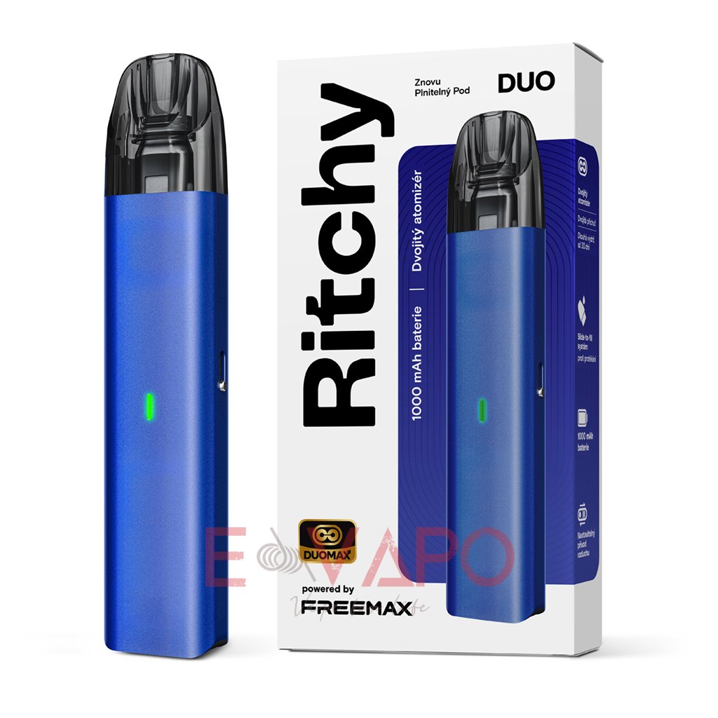 Ritchy DUO Pod Kit je moderní elektronická cigareta navržená pro pohodlné každodenní používání. Díky automatické aktivaci potahem, kompaktním rozměrům a stabilnímu výkonu představuje ideální volbu pro začátečníky i zkušenější vapery, kteří chtějí funkční a nenáročné zařízení.