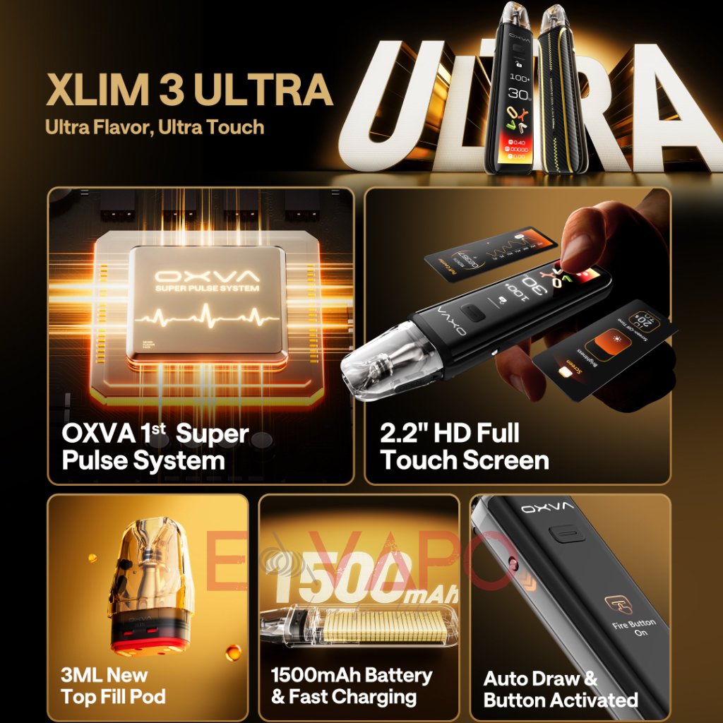 OXVA Xlim 3 Ultra je horkou novinkou, která posouvá hranice moderního pod systému. Nabízí 2,2” Full HD dotykový displej, baterii 1500 mAh s rychlým nabíjením, výkon až 30 W, a kombinaci špičkového designu, inteligentní technologie a prémiového zážitku z vapování.