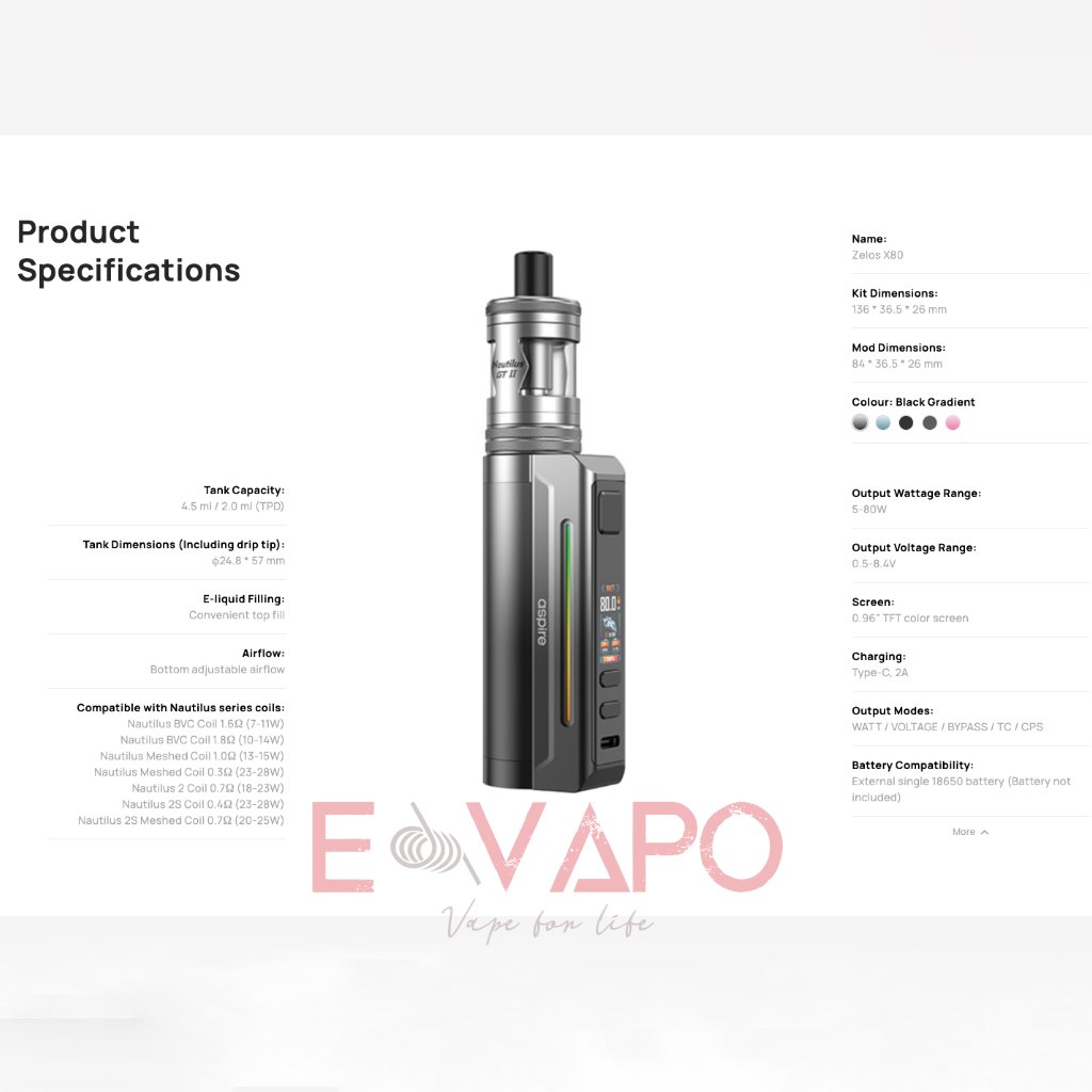 Elegantní, výkonný a spolehlivý! 💨 Aspire Zelos X80 s Nautilus GT II kombinuje 80W výkon, vyměnitelnou 18650 baterii a skvělý MTL/RDL zážitek v kompaktním těle.