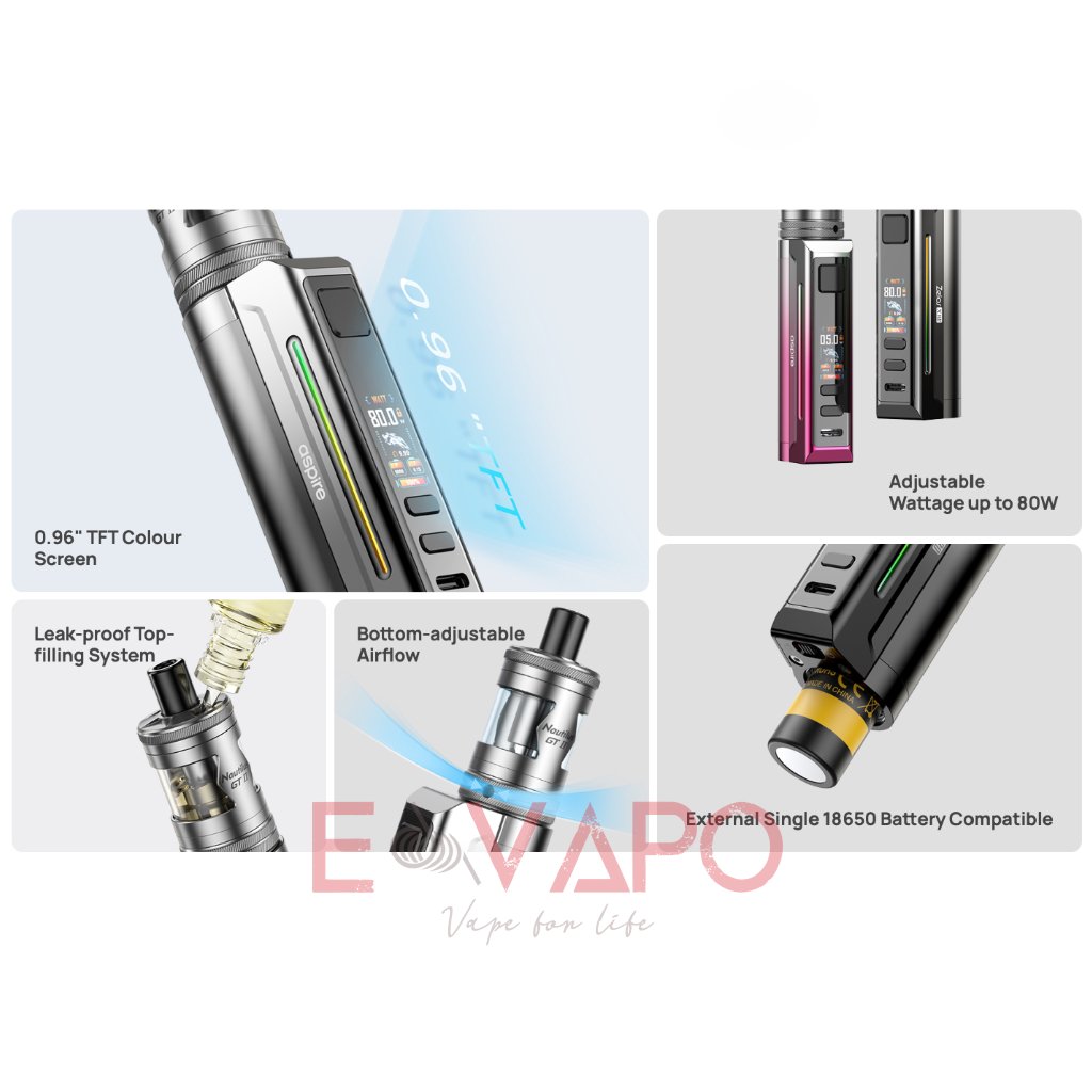 Aspire Zelos X80 přináší perfektní rovnováhu mezi kompaktním designem, vysokým výkonem a technickou precizností, kterou očekáváte od prémiové značky Aspire. Tato sada spojuje výkonný mod Zelos X80 s legendárním atomizérem Nautilus GT II a nabízí skvělý zážitek z vapingu jak pro MTL, tak RDL uživatele.